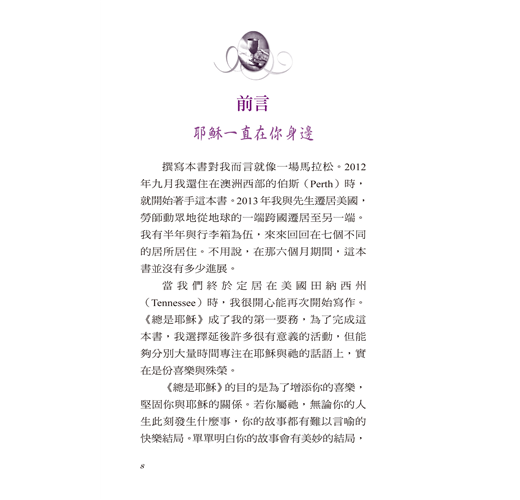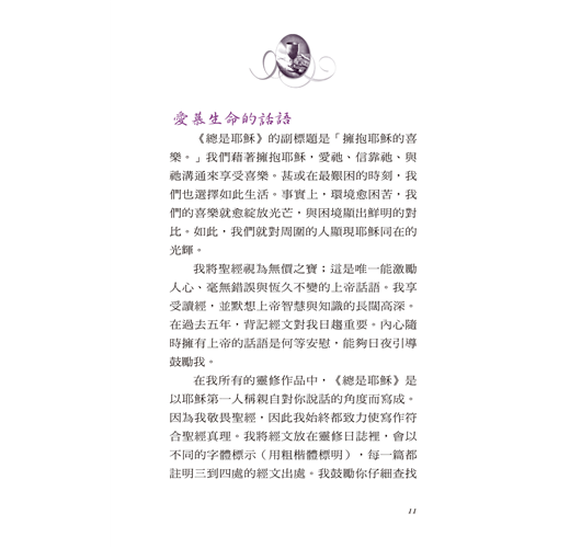 生活充滿了困難,喜樂似乎遙不可及。《總是耶穌》將堅固你與耶穌的關係。我們藉著擁抱耶穌,愛祂、信靠祂、與祂交通來享受神人連結的喜樂。