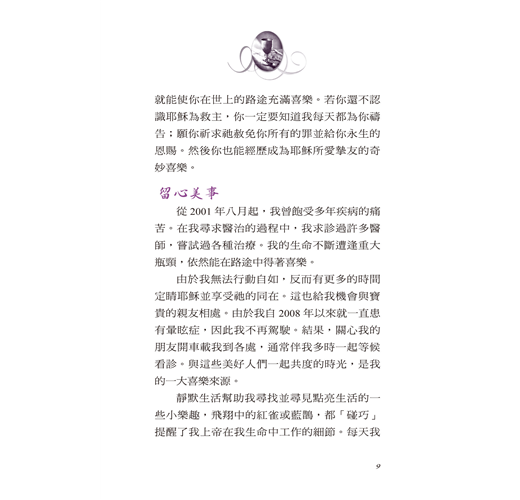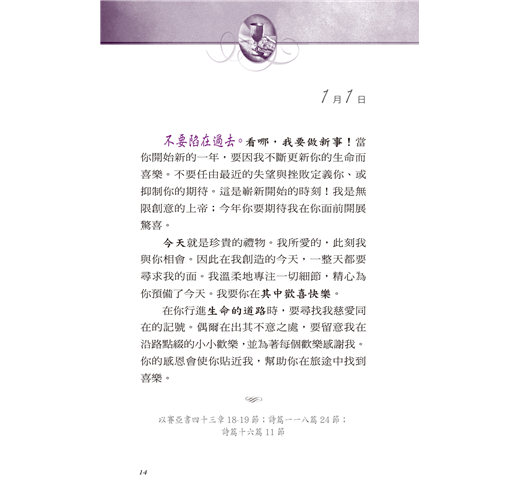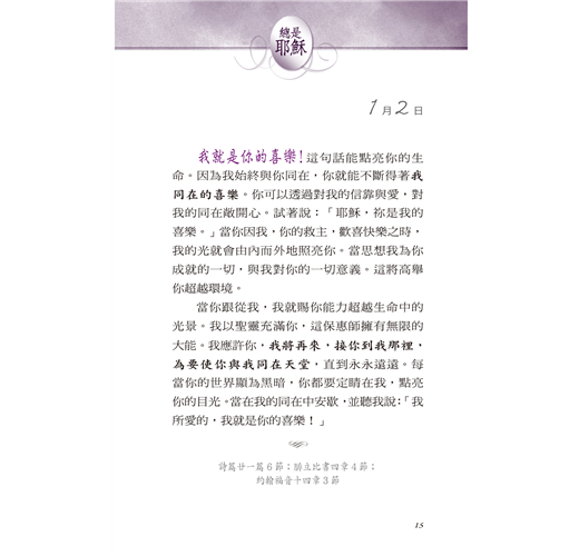 每一篇短文皆本於聖經,流露出愛與一信心的叮嚀,如同主耶穌親自對你說話,邀請你進入新的生活,擁抱喜樂與盼望。