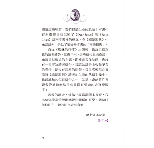 本書內容的目的是為了帶給信徒喜樂,增進與耶穌的關係。本書含366篇文章供讀者每日閱讀,來自上帝話語充滿喜樂的叮嚀,就像耶穌直接對你說話一樣。