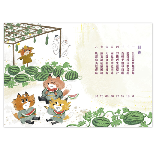 狐狸私塾勤練功,更少不了季節美食滋味。「春吃芽,夏吃瓜」,夏季盛產瓜果,水分多汁、消暑解熱,紛紛入菜書中佳餚,不論是同小狐狸們,賽後來杯沁涼的西瓜汁,或是同隨園先生,夏夜辦桌品嘗瓜甜美味,以書香佐美食,佐蛙鳴蟬聲,帶小讀者在炎炎夏日,體驗閱讀與口腹兼具的節氣好生活。