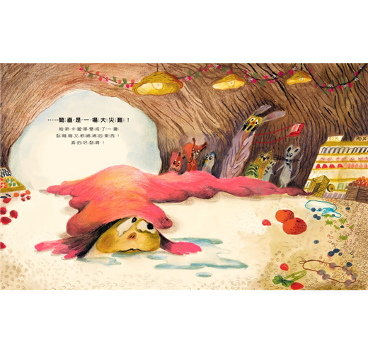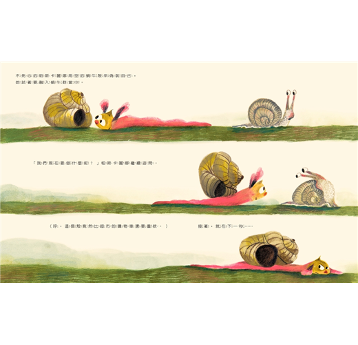 帕斯卡麗娜和媽媽去森林裡的超市買東西,超市很大,什麼東西都有……蛞蝓棒棒糖、蟋蟀洋芋片、畫翅膀的螢光漆、蜻蜓拖鞋……每樣商品都是帕斯卡麗娜「看過最棒的東西」,每樣東西她都想要。她愈是想要,口水就流得愈多,讓她的身體愈拖愈長,變成了一攤黏糊糊又軟綿綿的東西。