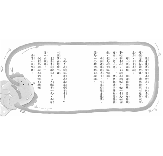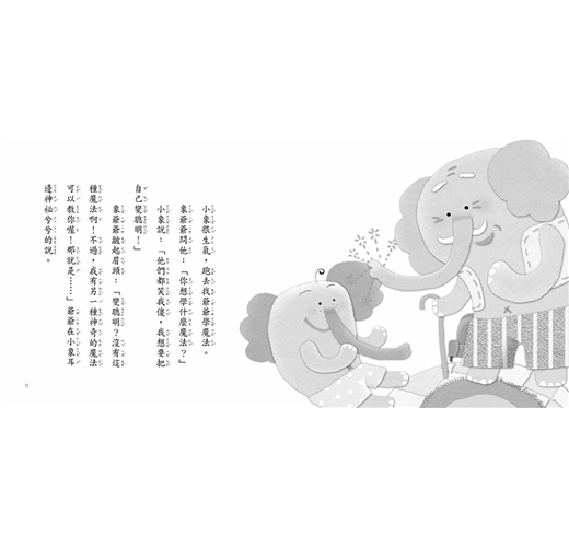 象爺爺皺起眉頭:「變聰明?沒有這種魔法啊!不過,我有另一種神奇的魔法可以教你喔!那就是……」爺爺在小象耳邊神祕兮兮的說。