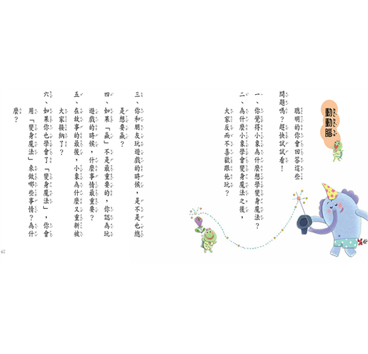 提醒您,每個故事後面還附加思考問題或創意遊戲,提供親子共讀或班級集體閱讀之用,非常方便實用又有趣味。