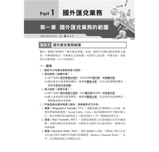 和沒有報考資格限制的「外匯交易專業能力測驗」相比,「外匯交易專業能力測驗」考題趨勢是著重於外匯市場之基本概述、相關工具之介紹與應用等,屬於基本常識的範疇,而「初階外匯人員專業能力測驗」則是偏重實務操作的流程,比方說「國外匯兌業務」中的「匯出/匯入匯款處理程序」、「光票買入及託收」是重要大考點,由內容觀之,便可知道其為實務運用操作,若非專業人員可能對這些考點就不甚熟悉了!