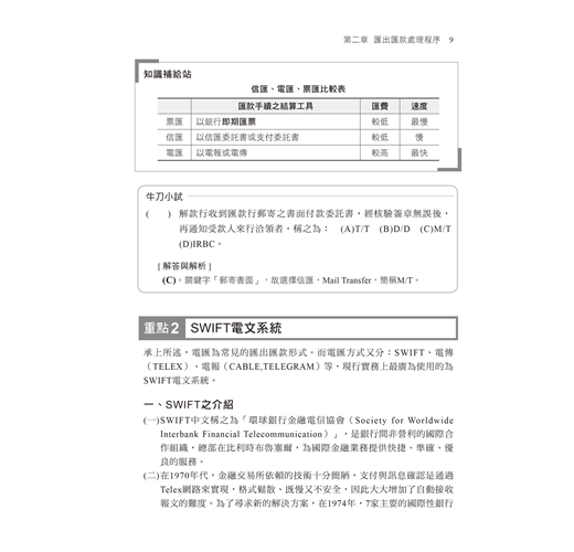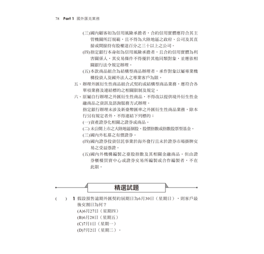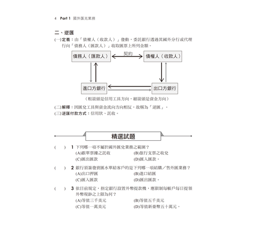 建議你於熟稔「國外匯兌業務」及「進出口外匯業務」兩大單元重點後,亦依照書本編排小範圍的牛刀→中等範圍的章後精選試題→大範圍的歷屆試題,勤加練習,以增加記憶及培養手感,相信一次就能高分考取初階外匯證照!