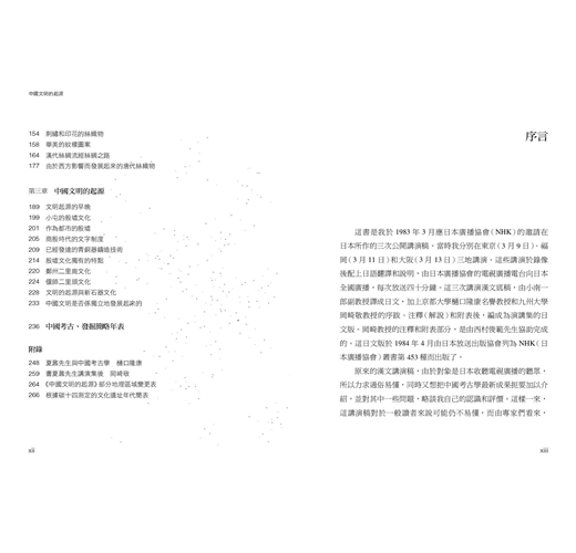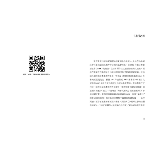 此書是夏鼐先生於1983年應日本廣播協會(NHK)的邀請,在日本所作廣播講演的文稿集,包括了《中國考古學的回顧和展望》《漢唐絲綢和絲綢之路》《中國文明的起源》三部分內容,是夏鼐對中國文明起源系統性研究的代表作,對中華文明探源工程產生了重大的學術影響。