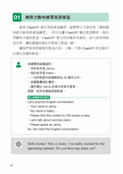 本書一開始便針對英語對話練習做介紹,讓你學會用指令馬上跟 ChatGPT 即時互動,還會修正你的英文,讓你的英文不說錯。