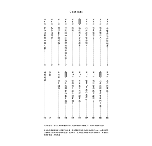 推薦給臺灣的政策制定者、專業工作者、家長親友,思考該為兒少照顧者做的事;而對有相同經歷或懷疑自己也是兒少照顧者的你,這本書也能帶來療癒與振奮。」