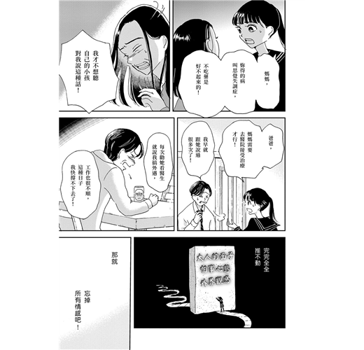 思覺失調症的母親、對家人漠不關心的父親、格外受寵的弟弟、阿茲海默症的爺爺……這是本書主角小唯成長的家庭環境。被迫成為小大人的她,照料這個家的大小事,還獨自承擔母親的情緒與暴力。