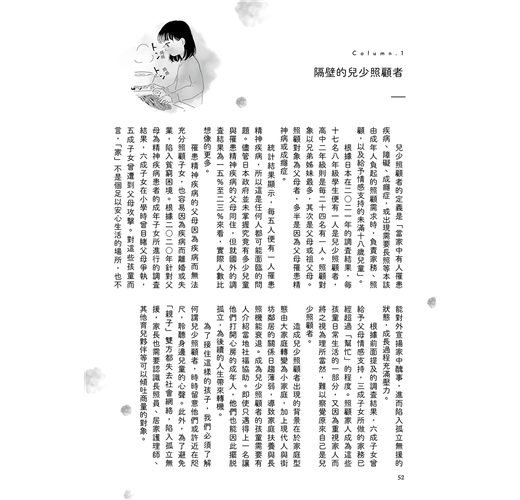 2.這不是一本純虛構作品!內容取材自多名兒少照顧者與醫療工作者的真實經歷,以細緻的圖像和運鏡刻劃最真實的故事,傳達純文字所無法表現的深度與張力。