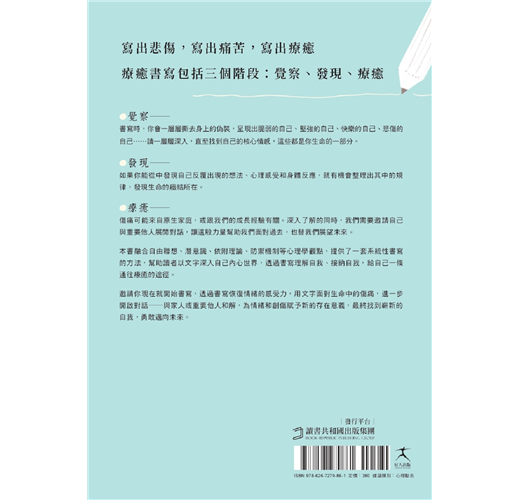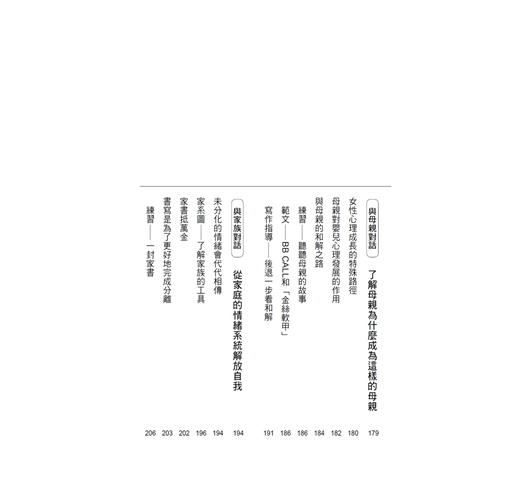邀請你現在就開始書寫,透過書寫恢復情緒的感受力,用文字面對生命中的傷痛,進一步開啟對話──與家人或重要他人和解,為情緒和創傷賦予新的存在意義,最終找到嶄新的自我,勇敢邁向未來。