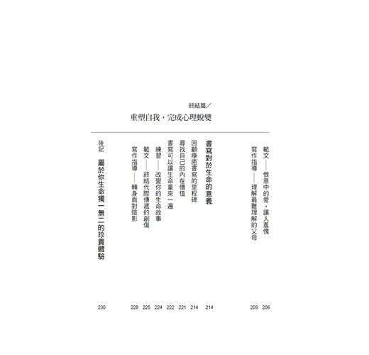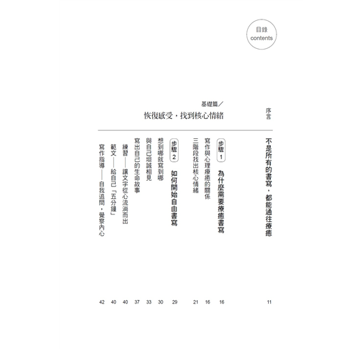本書總共分為四個篇章,從一開始的基礎引導到最後的自我重塑,都為了讓這一路的書寫歷程通往自我療癒的目標。接下來我先簡單說明本書的特色。