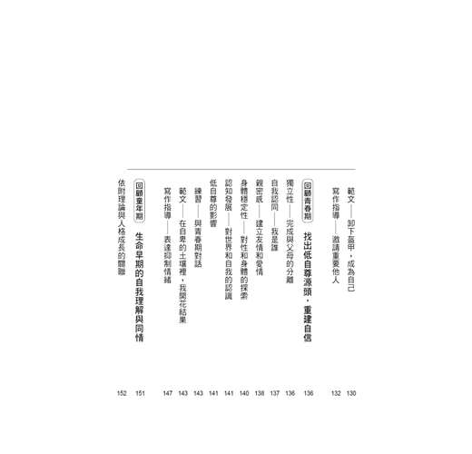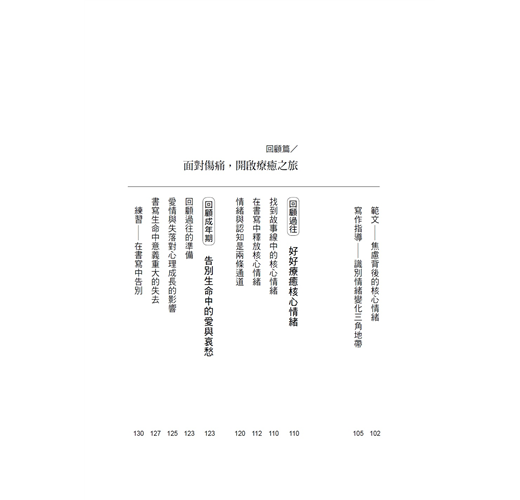 第二篇是回顧篇。我們要從不同的成長階段,找出當時挑起核心情緒的事件,也就是說,我們要根據「感受」這條線索來回憶過去。此時大多數人回憶的並不是美好的事件,因此在進入第二篇回顧過往時,你可能會感到恐懼,但在這個階段,我希望你能正視這份傷痛。如果跟著全書的練習走到最後,相信你一定會非常感激自己勇敢面對,因為將最深刻的想法和感受表達出來,這樣的表達本身就是一種自我療癒。當然,如果此時喚起的情緒太過痛苦,你可以先暫時擱置,做點別的事讓自己放鬆下來,過段時間再試著書寫。