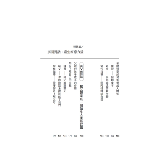 第三篇是對話篇,讓我們與自己生命中的重要他人展開對話。當我們能面對生命中的創傷、遺憾和失去,我們內心也會產生一股力量,幫助我們面對現在的自己,發現生活中其實還有很多重要的人事物。