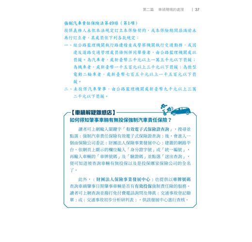 本書另一特色是書中各章節提供的各式書表、訴狀、範例解說及流程圖示等,內容淺顯易懂且都非常實用。車禍處理實務上常見的問題,筆者也以【車禍解疑雜惑店】詳加說明。