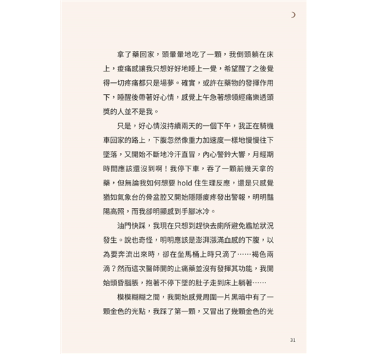 拿了藥回家,頭暈暈地吃了一顆,我倒頭躺在床上,痠痛感讓我只想好好地睡上一覺,希望醒了之後覺得一切疼痛都只是場夢。確實,或許在藥物的發揮作用下,睡醒後帶著好心情,感覺上午急著想領經痛樂透頭獎的人並不是我。