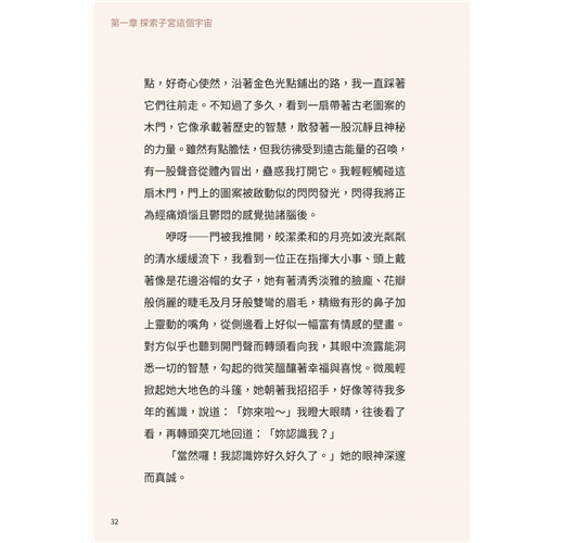 模模糊糊之間,我開始感覺周圍一片黑暗中有了一顆金色的光點,我踩了第一顆,又冒出了幾顆金色的光點,好奇心使然,沿著金色光點鋪出的路,我一直踩著它們往前走。不知過了多久,看到一扇帶著古老圖案的木門,它像承載著歷史的智慧,散發著一股沉靜且神秘的力量。雖然有點膽怯,但我彷彿受到遠古能量的召喚,有一股聲音從體內冒出,蠱惑我打開它。我輕輕觸碰這扇木門,門上的圖案被啟動似的閃閃發光,閃得我將正為經痛煩惱且鬱悶的感覺拋諸腦後。