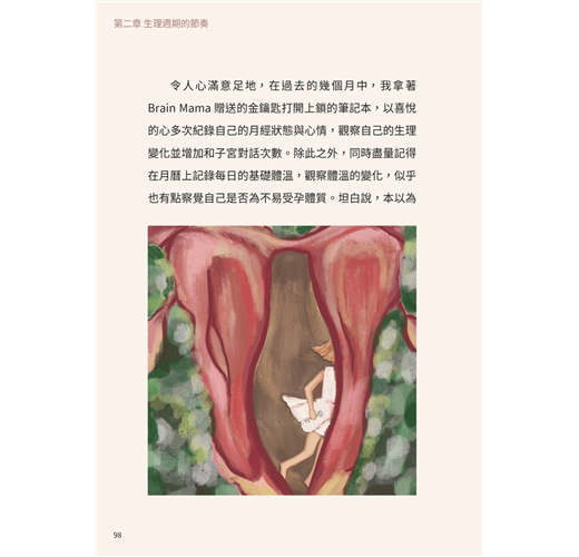 令人心滿意足地,在過去的幾個月中,我拿著Brain Mama贈送的金鑰匙打開上鎖的筆記本,以喜悅的心多次紀錄自己的月經狀態與心情,觀察自己的生理變化並增加和子宮對話次數。除此之外,同時盡量記得在月曆上記錄每日的基礎體溫,觀察體溫的變化,似乎也有點察覺自己是否為不易受孕體質。坦白說,本以為更認識自己會是愉快的過程,實際上卻是有點複雜的沮喪感,也以為自己是以喜悅之心面對,實際上卻頻頻感