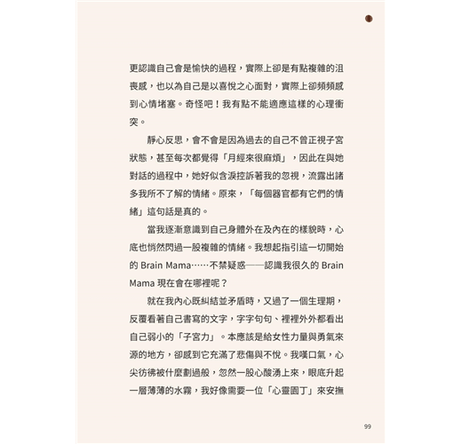 就在我內心既糾結並矛盾時,又過了一個生理期,反覆看著自己書寫的文字,字字句句、裡裡外外都看出自己弱小的「子宮力」。本應該是給女性力量與勇氣來源的地方,卻感到它充滿了悲傷與不悅。我嘆口氣,心尖彷彿被什麼劃過般,忽然一股心酸湧上來,眼底升起一層薄薄的水霧,我好像需要一位「心靈園丁」來安撫子宮花園。闔上筆記本,用金鑰匙上了鎖,放回木箱子;畢竟是個人隱私,我不想被外人窺探。