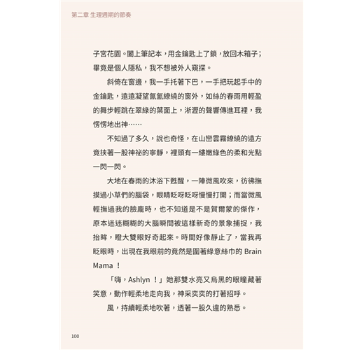 而我們處在這個世代是幸運的。這本書將代替那些羞澀的媽媽們陪伴每位小女孩以喜悅的心進入一趟與子宮對話的旅程……相信是一個更認識自己的覺醒過程,開啟與生俱來的內在智慧,找到生理週期的優勢和秘密並帶入生活中,妳會發現,當找回自己的旋律與能量時,將會比想像的更獨特、更迷人!