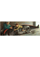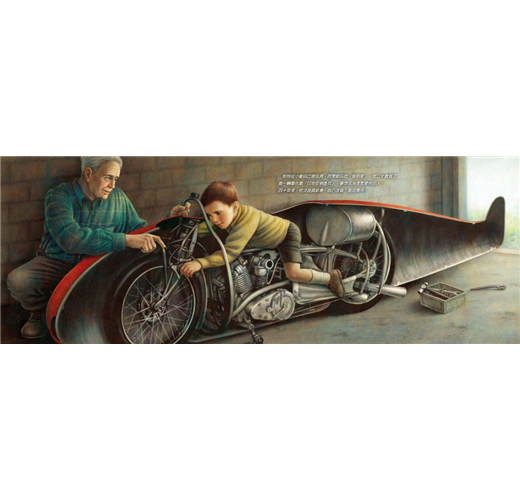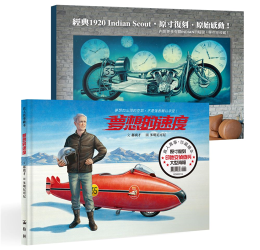 為了忠實傳達故事的意旨,編輯團隊特地邀請畫家多明尼可尼,加碼繪製印地安摩托車原寸海報。在研究各式零件與車廠相關歷史後,以講究的印刷功夫拼貼出一張全長228cm、寬100cm的原寸大海報,攤開後讀者既可以欣賞多明尼可尼精緻的佳作,體驗原寸復刻的感動;摺疊收納進專屬信封禮盒後,又能成為獨一無二的收藏,甚至也能當作精美禮物,送給所有心中有夢的人!到頭來,夢想的速度無關追逐的快或慢,因為一旦走出自己的道路,也只有自己最知道如何定義自我的心之所向。
