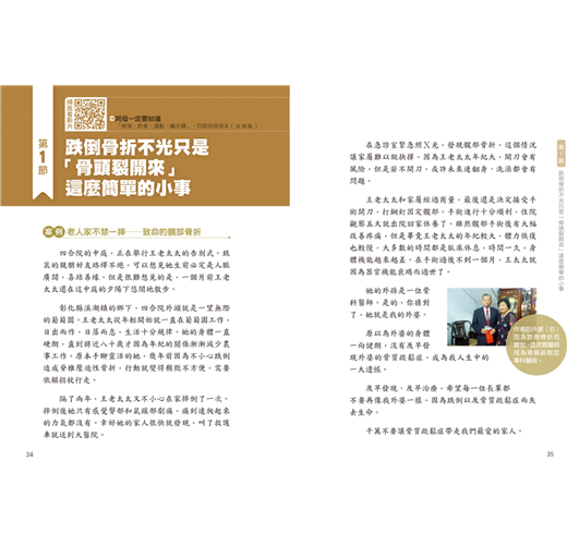 尤其作者所舉的案例一即是他最親愛的外婆,原本身體一向健朗,沒想到因為跌倒以及骨質疏鬆症而最終失去生命,對於身為專業骨科醫師的作者,是一段多麼痛心不捨的人生歷程。