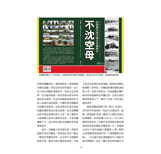 這本我在2015年出版,原名為「不沈空母——台灣島內飛行場百年發展史」的書,是前前後後花了將近20年資料收集,實際寫作也大約經過10年才完成的一本書。這本書的題材,相信是許多讀者在知道我眾多鐵道相關研究書籍外,一個比較少人理解我長期投注心力的課題。這些飛行場遺跡與歷史的研究,全部都不是依靠調查研究計劃在支持,真的純粹就是個人的興趣,因此才會如此持續不斷地挖掘史料與實地踏查整理,最後甚至完成這本書。