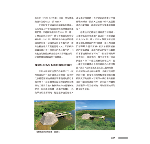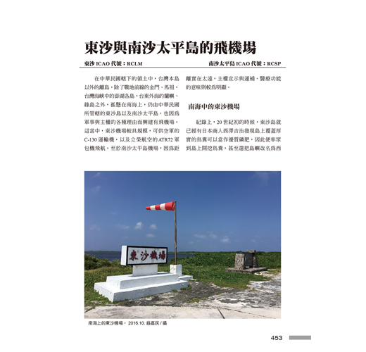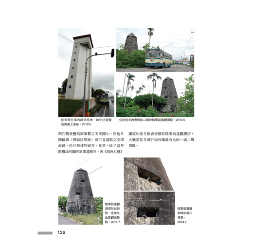 除了這些飛行場周邊的軍事碉堡外,也特別感謝澎湖的吳令丞老師,提供許多澎湖在地的軍事調查史料;而師大地理系出身的學生許純鎰,也提供金門飛行場的一些資料,在此特別感謝。至於我的研究生柯孫禮,因為對機場調查的興趣,跑遍了金馬澎湖、蘭嶼綠島這些的離島,因此讓這本書最後新增的離島機場篇章,能夠有適合的照片,可以說貢獻最大。至於孤懸於南海上的東沙機場,一般人還是難以抵達,非常感謝翁嘉民先生的照片提供。