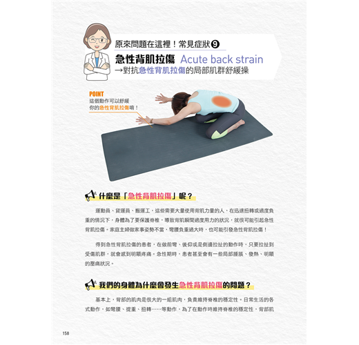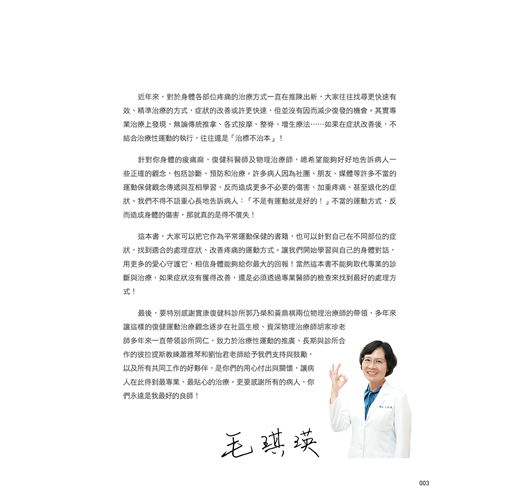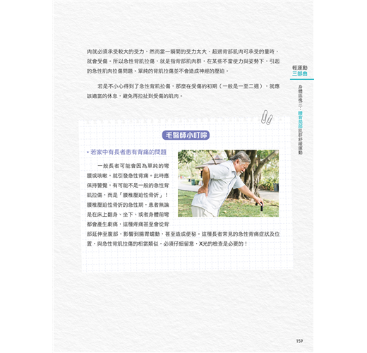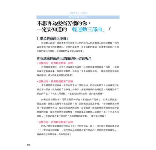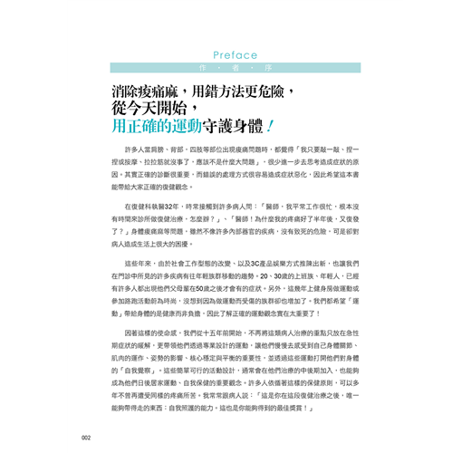 諸如此類的問題在前言統一解答,並透過精美的拉長頁開啟健身運動的大門,讓復健醫師為你先打造正確的醫療觀念,再開始動起來!