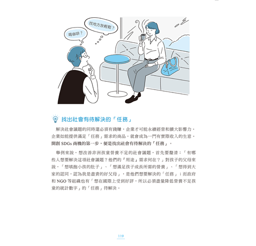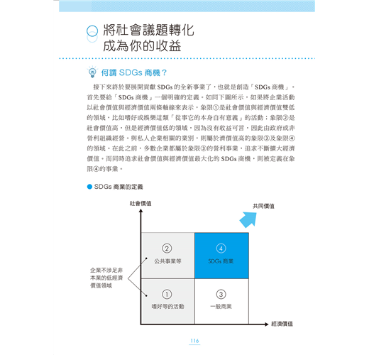 本書將SDGs視為「商場上鴻圖大展的魔法」,原因是「在價格與品質相同」的前提下,顧客必定會選擇利益社會及友善環境的一方」,而這也是企業謀求生存發展的未來趨勢。