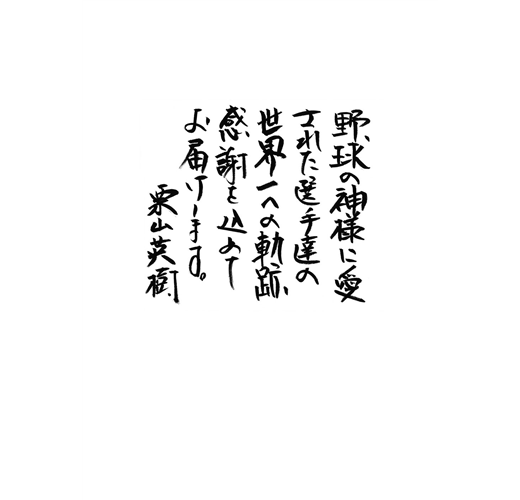過去在我的履歷書裡,沒有什麼特別值得稱道的事情,現在則加入了WBC冠軍這項輝煌的經歷。圓滿達成重大任務,讓我的內心的巨石終於放下。然而,實際在拼戰的是那些選手們。我腦海中浮現《四書五經》孟子曾說過的:「聲聞過情,君子恥之。」我感覺到大家對於「栗山英樹」這個人的評價,顯得言過其實了。