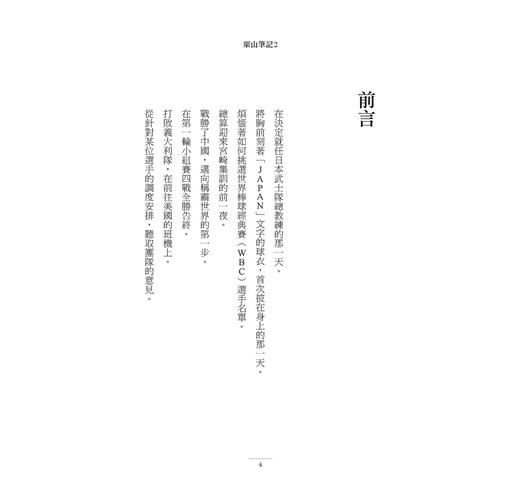 然而,或許我寫下的這些話語,除了我之外,還能帶給他人一些參考──就在WBC結束後不久,有人對我這麼說了類似的話。有位日本電視圈的大人物,也是人生的大前輩,告訴我:「讀了栗山筆記後,就不用費心鑽研古典了。」