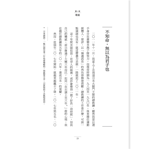 為了選手、為了球隊,我這個總教練到底能做些什麼?到底有什麼事情非做不可?我過著每天都捫心自問,探索自我職責的日子,學習著棒球、學習著人生。除了閱讀在政治與經濟方面成功者的著作,我也參考了歷史書、古今中外的典籍。