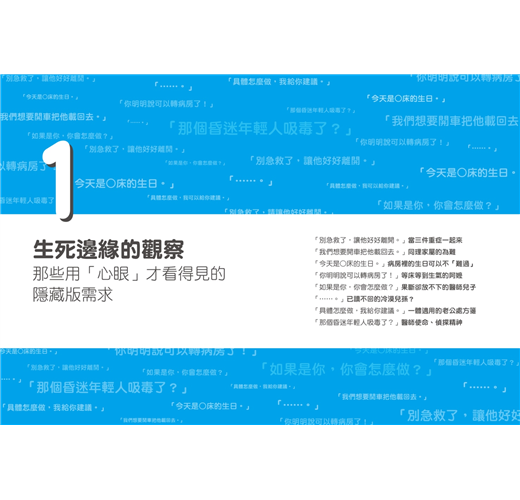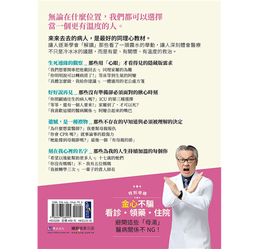 阿金醫師的故事幫助我們看到了這一切,讓我們對醫師、護理師更加了解、也增加了對彼此的信任與體諒。這對整體社會醫病關係的促進,是非常重要的!真心感佩阿金醫師在繁忙的醫療工作之餘,還為了提升醫病關係投入這樣的心力。誠心推薦這本好書給您。阿金醫師的這些故事,會讓您對生命有更不一樣的思考,對這世界更知福、更惜福。