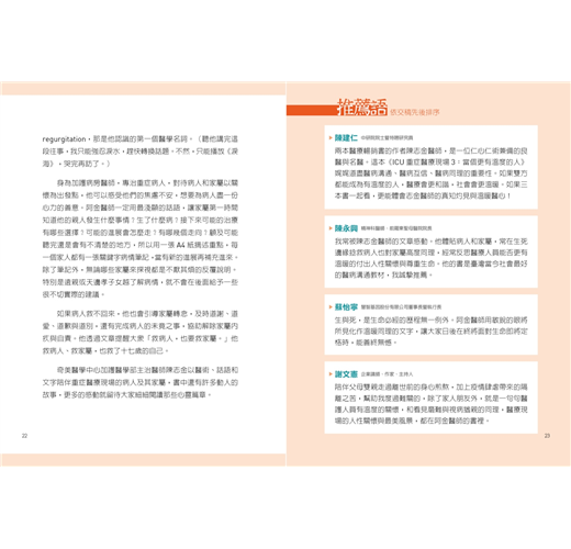 陳醫師的這本書,走入重症醫師的內心,突顯他秉持仁心仁術體恤幫助受苦的病患,讓美好的醫學人文精神被看見,是敘事醫學的積極實踐,也是最佳的參考書,本人鄭重推薦給所有的醫護同仁及一般大眾。