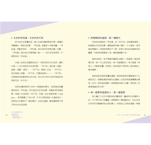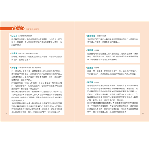 奇美醫學中心加護醫學部主治醫師陳志金以醫術、話語和文字陪伴重症醫療現場的病人及其家屬,書中還有許多動人的故事,更多的感動就留待大家細細閱讀那些心靈篇章。