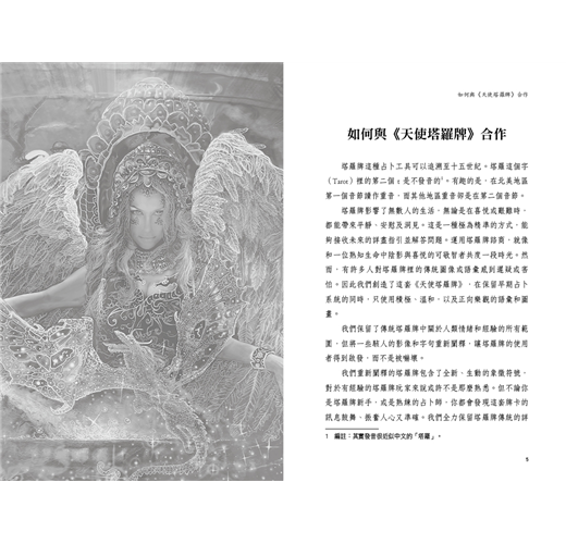 「《天使塔羅牌》的要點是天使特質和塔羅牌意涵的結合,是兼備塔羅牌架構的天使學,也因而自成一套體系,許多大阿爾克納牌的名稱和象徵圖案做了更動,因而不見「教皇」,也沒有「魔鬼」。尤為特殊的是,大阿爾克納的串連故事以嶄新的「夢想家之旅」詮釋塔羅牌的愚人旅程,最精湛的旨趣就在於此。」