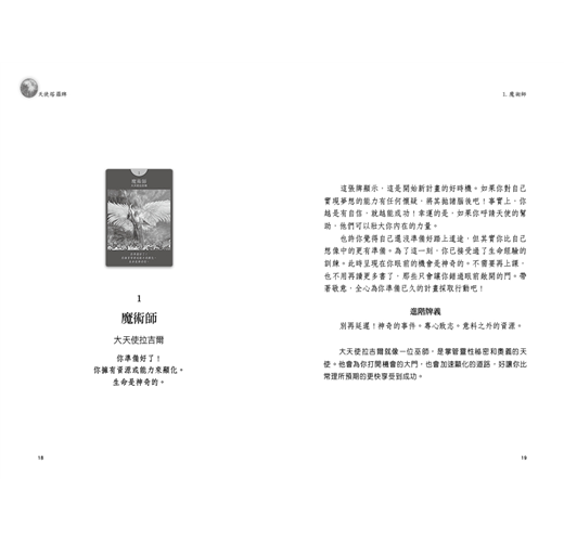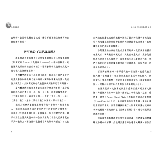 通常人們會將整副塔羅牌當作是一套牌卡。然而有些人,像是我就喜歡將大阿爾克納和小阿爾克納分開使用。你使用《天使塔羅牌》時,會發現每一張大阿爾克納牌,都以十五位主要大天使中的一位作為主角(有些大天使出現在不只一張牌上,因為他們也體現了其他牌卡的面向)!這些大天使在你靈性道路的旅程中提供了強大的保護和清楚的指引。大阿爾克納牌也能和其他的天使神諭卡混合使用,在解讀中提供更多細緻的解釋。