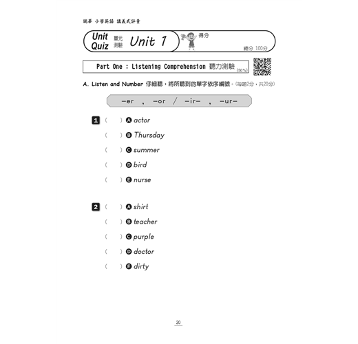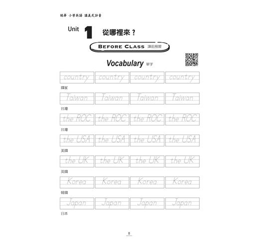 6. 加贈小學各年級瑞華英檢單字。瑞華英檢單字係本公司經過對於各版本教材進行分析,依照難度分出6級有助於小學學童迎戰全民英檢的單字庫,本系列字帖隨書附贈適合該年級程度的分級單字字帖於每單元之後,也有搭配的 QR Code 音檔讓同學寫字背單字之餘,也加強單字聽力。