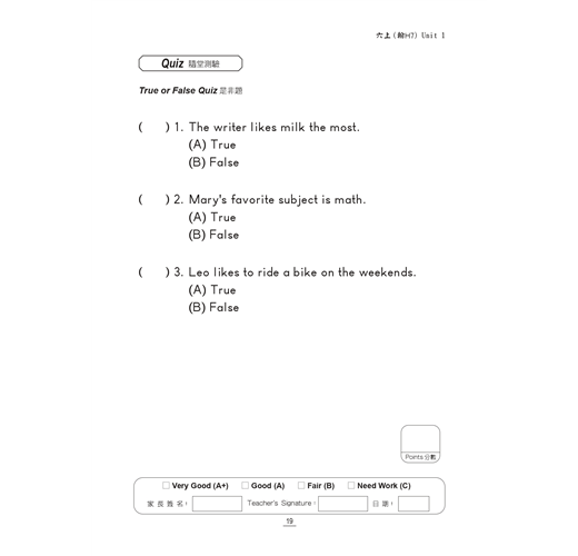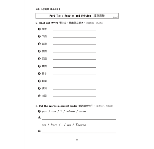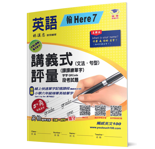 為強化小學生在英文有效學習及書寫的能力,特別編著「版對版」、「課對課」的書寫練習講義式評量參考書,每單元一回測驗、兩次段考試題。