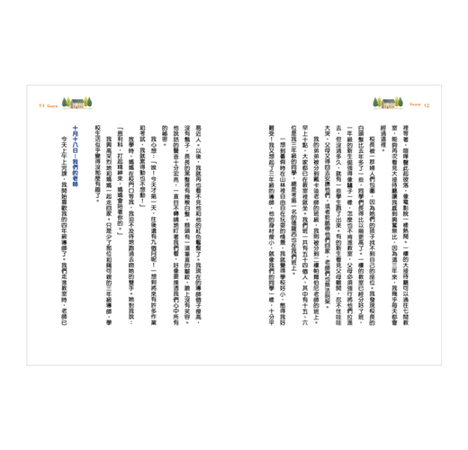 善於觀察周遭人事物的恩利科,身邊有許多值得他效仿的好朋友:行俠仗義的大塊頭卡羅納、雍容大度的學霸德羅西、挑戰自我的駝背納利、替父母分憂解勞的柴商兒子科列帝,以及懂得反省自我的富家少爺沃提尼。除此之外,家人對他的諄諄教誨也十分受用,包括「友愛他人不分階級」、「珍惜自身擁有的一切」、「不可拿家人出氣」等。老師每個月在課堂上說的小故事,亦啟發了他對國家的認同與歸屬。這一篇篇的日記,記錄著恩利科對於生活的細膩心得,現在我們邀請您走入書中,一同欣賞他多采多姿的小四生活。