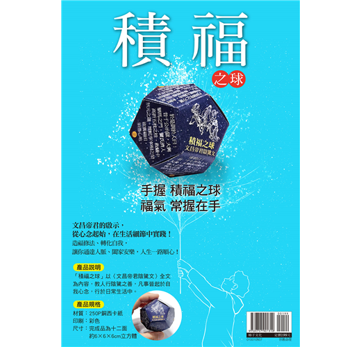 「積福之球」本源於柿子文化出版的《積福之書》,此書依據清同治六年(西元一八六七年)奉天錦府文英齋《陰騭文圖說》刻本做了全新企劃、整理再版,除了《文昌帝君陰騭文》的原始文字,並以易於閱讀的白話文本做了全新的說解,每一條目下的故事亦有早期木板畫搭配。此外,還收錄了唐朝元和時期人蔡明經(號鐵耕先生)所著〈陰騭文詩箋〉,內容詞句優美警切,值得吟誦賞析。
