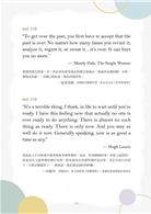 如果你之前從未讀過收錄名言的書籍,我想在此強調,在人生中對的時刻讀到一句對的語錄,可讓你留下無比深刻的印象。訣竅在於要在恰恰好的時間點,找到恰好是你需要聽到的那句話,讓你能找到改變的勇氣,因為你知道這些改變能引導你走向正確的道路。這些佳句本身無法改變世界,只有當你意識到這些話語真是再真實不過,比你看過、聽過、觸碰過的任何事物都來得真實,這時這些文字才會躍然紙上,賦予你意志去實踐這些話語。