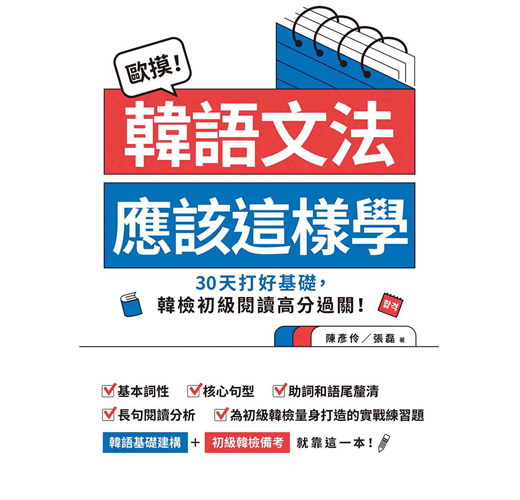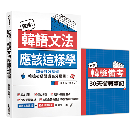 大量實用例句和練習題,讓你立刻獲取最實用的句子及使用方法;全書練習題以「初級韓檢題型」為主軸設計,文法基礎觀念學習與初級韓檢閱讀備考同時高效進行,實力、分數一次擁有。