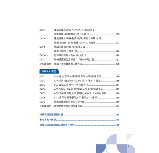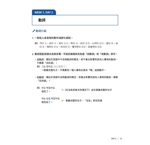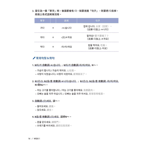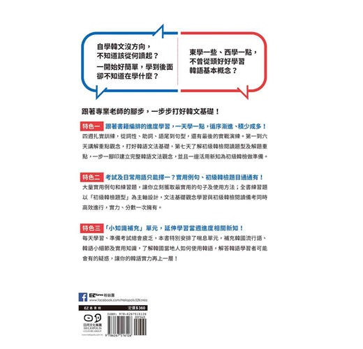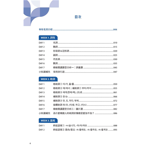 四週扎實訓練,從詞性、助詞、語尾到句型,還有最後的實戰演練。第一到六天講解重點觀念,打好韓語文法基礎,第七天了解初級韓檢閱讀題型及解題重點,一步一腳印建立完整韓語文法觀念,並且一邊活用新知為初級韓檢做準備。