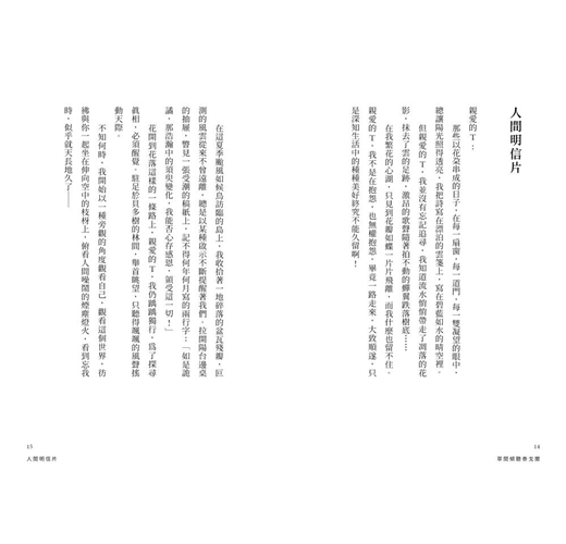 「親愛的T,當死亡逼臨時,我祈願看到那片辭枝的落葉,輕盈乘風,充滿感恩地俯吻大地,不是荒涼的滅寂,而是隱約一抹微笑的安恬靜謐―」