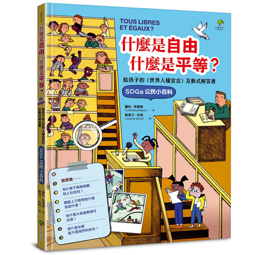 ★告訴老師:「自由」與「平等」一直是重要的公民概念,然而孩子(甚至成人)經常誤會其中的涵意,反而侵犯到他人的權利。這本書運用了實際的情境案例,從認識《世界人權宣言》開始,清楚解釋「自由與平等」、「權利」的概念,非常適合在課堂上運用與討論,建立孩子的公民基礎。