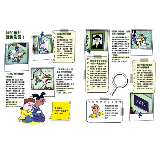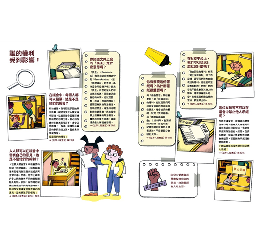 ★告訴家長:當孩子說出「這是我的自由」、「不公平」時,我們常常不知道該怎麼跟孩子解釋:為什麼不能無限上綱「自由與平等」的概念,而是必須學會尊重他人的權利。透過書中的人權探索小遊戲,跟孩子一起深入討論「自由」與「平等」的定義。