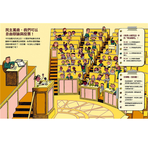 從認識《世界人權宣言》開始,啟發孩子邏輯思考能力、開啟親子溝通與對話、了解「自由」與「平等」的真諦,「保護自己」也「尊重他人」的權利。