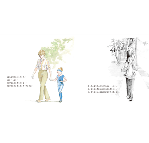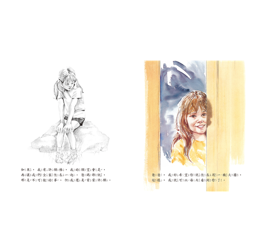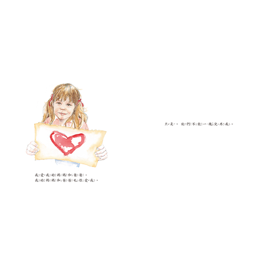 全書的第一個畫面,只見一個臉部表情憂鬱、雙手環胸的小女孩,搭配的文本是:「我的媽媽和爸爸再也不住一起了!」但到了最末,小女孩的表情變了,她帶著笑意說:「我愛我的媽媽和爸爸。我的媽媽和爸爸也很愛我。只是,他們不能一塊兒疼我。」兩幅圖前後呼應,呈現了過程中父母的努力、調整和溝通,讓孩子重新找到安心與穩定。